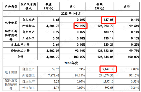 也就是说,公司目前核心原材料显示模组主要依赖外购,将显示模组等原材料组装加工成电子价签终端产品则全部依赖外协加工,自主产能较少。