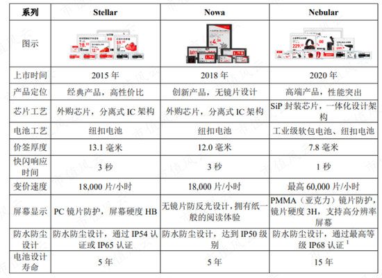 公司电子价签终端产品主要包括Stellar、Nebular、Nowa和Lumina四大系列,其中营收贡献最大的两款为Stellar和Nebular。