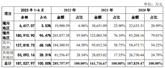 2020年、2021年、2022年和2023年上半年(下称报告期),公司境外营收占比分别为79%、76%和93%和96%,其中来源于欧洲地区的收入占比分别为54%、59%、65%和68%。
