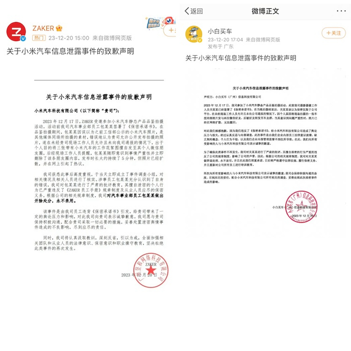 12月20日下午,前述媒体相继就小米汽车泄密事件发布致歉声明,并称对涉事员工做出开除、辞退处理,永不录用。据“ZAKER”声明称,该事件是由员工违背《保密承诺书》引发,给小米带来了一定的舆论压力和影响,对此向小米表示诚挚歉意。