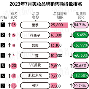 蝉妈妈平台显示,里季在近一年内销量显著增长,于今年7月栖身抖音美妆榜单Top5,为近半年来首次上榜。根据《2023年7月美妆抖品牌里季、VC美妆、娇润泉社媒营销电商分析报告》综合直播销售、自然销售等各项数据,在兰蔻、薇诺娜众多品牌当月销售额指数里季*。虽然上榜一次之后很快跌下前20,但根据统计数据,里季近半年贡献破亿销售额,销量超100万件。
