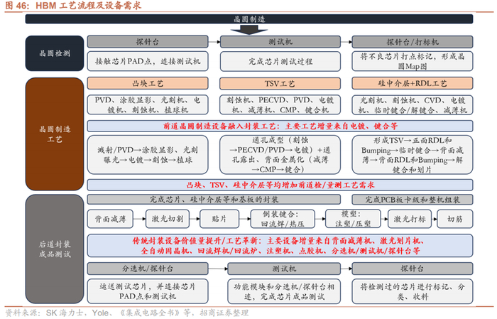 据招商证券整理,HBM中大量增加前道工序,前道检、量测设备主要增量来自微凸点、TSV、硅中介层等工艺,另外HBM中增加的预键合晶圆级测试和KGSD相关的封装级测试也带动分选机、测试机、探针台等后道测试设备的数量和精度提升;由于HBM堆叠结构增多,要求晶圆厚度不断降低,进而提升了减薄、键合等设备需求。