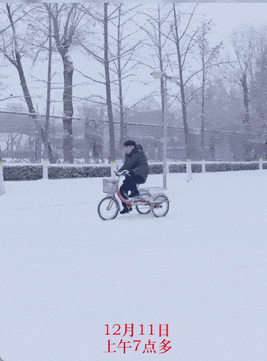当时北京雪下的挺厚,老人骑车明显感觉有些吃力,但是他仍旧一步一步缓慢地骑着。