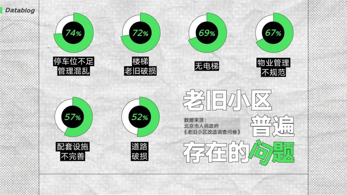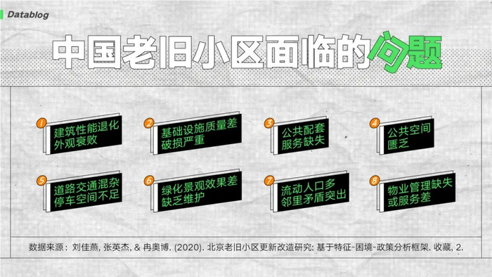 清华大学建筑学院的学者曾做过研究,将老旧小区存在的问题总结为八类。除了刚才提到的,还有像停车难、流动人口多、邻居闹矛盾、物业服务差或压根没物业等。