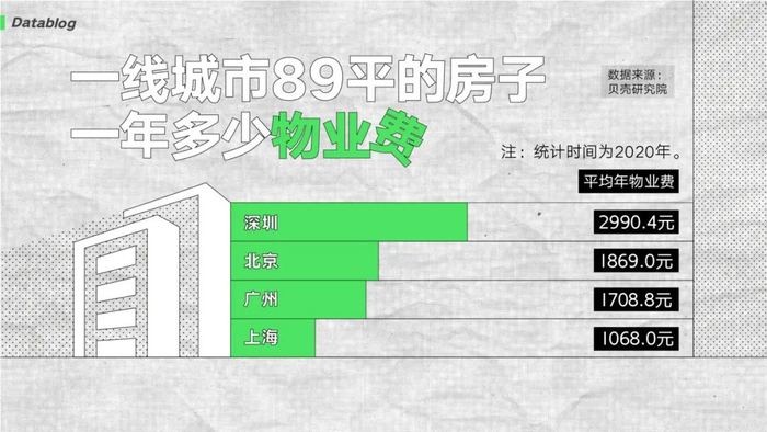不同城市间的物业费水平差异也很大。最贵的深圳,一年将近三千块。一线城市里,被大家调侃“有一套自己汇率”的上海,物业费整体水平反而最低,平均一千出头。当然,这可能是因为上海老小区比较多,所以看着便宜。