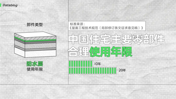 像防止渗漏发生的防水层,使用年限 10 或 20 年。房子的“厚外套”保温层寿命长一些,但也就 25 年。