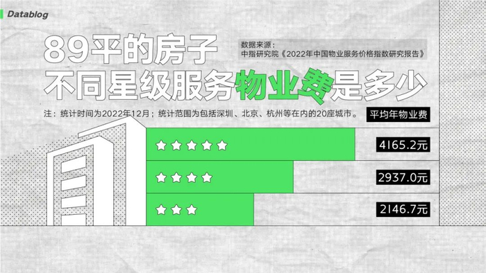当然,服务越细致,收费肯定越贵。假如你住的是最常见的 89 平小三居,2022 年五星级、四星级和三星级的物业费平均在 4165 元、2937 元和 2147 元。
