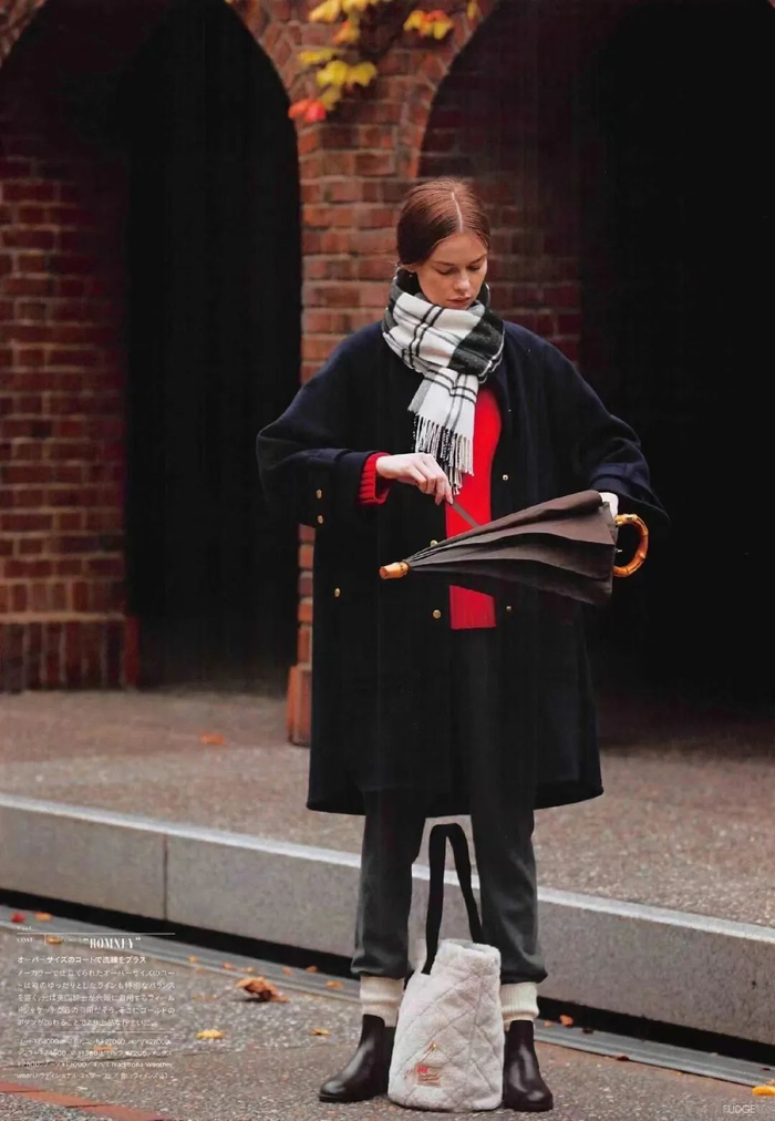 深色系有种沉静美,和秋冬以暗色为主调的衣服百搭。外套、包包、鞋子、内搭、袜子不知如何搭配,闭眼选深色系准不会出错。出门在外,与自然融为一体,非常纯粹~