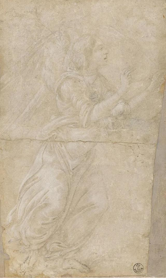 19世纪,因为素描稿《天使报喜》(1485-1490)长时间暴露在光线下导致墨水笔的痕迹几近消失。但若仔细观察,依旧可以辨出细而流畅的线条,这是15世纪后期波提切利绘画的特征。在素描稿上,波提切利为天使的手臂探索了至少四种不同的方案。还可以看到百合的长茎延伸到画面的左上角,这幅素描与《天使报喜》(约1485-1493,苏格兰格拉斯哥凯文葛罗夫博物馆藏)中的天使长加布里埃尔最为相似。