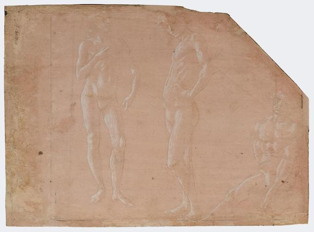 此外,《三个年轻人的研究》展示了波提切利用工作室中年轻的助理作为模特探索人体的不同形态,它突出了艺术家对银尖笔,探索性标记和细白线的使用。在此,利皮对他的教导显而易见,尤其是在粉色纸上白色色粉的画法将人物的下颌线和优雅的姿态凸显而出。