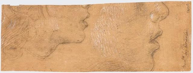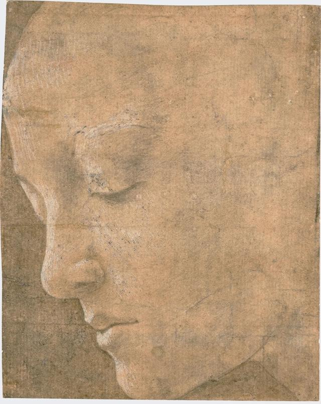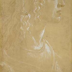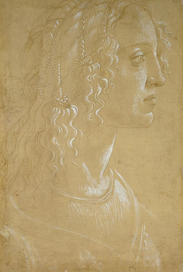 其中,女性和男性头像各一件用金属尖笔精心绘制,很可能是从同一张黄赭石纸上分割而成。《俯视左侧的女性头像》(约1468-1470年),可与《圣母子与年轻的施洗约翰》(约1465-1470年)对应。人物的圆眼睛、拱形眉毛和小而突出的嘴唇与画中的圣母十分相似。