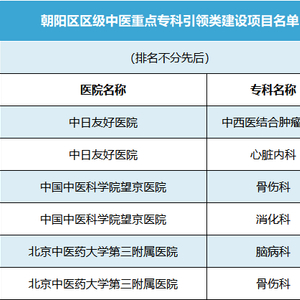 首都医科大学附属北京朝阳医院中医科主要诊治包括中医脑病、心血管病、呼吸病、脾胃病等,其中中医脑病中以中风病、头晕、头痛、失眠、脱髓鞘疾病为其主要特色,对于脑病的相关疾病,如糖尿病、高血压、高脂血症等亦有丰富的诊疗经验。