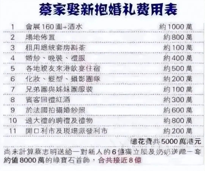 有媒体统计过,蔡家为这场婚礼豪掷8亿,是港圈史上最豪华的一场婚礼。