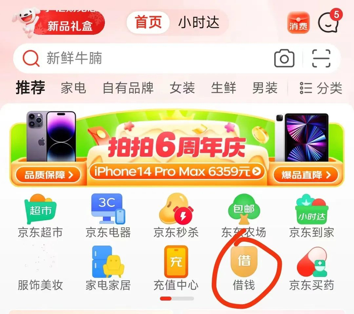 另外,京东APP首页的30个产品分类中,分3个滑动页面,“借钱”排在第一页的第9个位置,排在京东买药的前面。