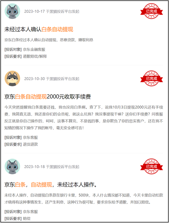 比隐藏提前偿还分期订单的入口更夸张的是,在黑猫平台有多位网友反映,京东金融-京东白条“未经本人操作自动提现”。