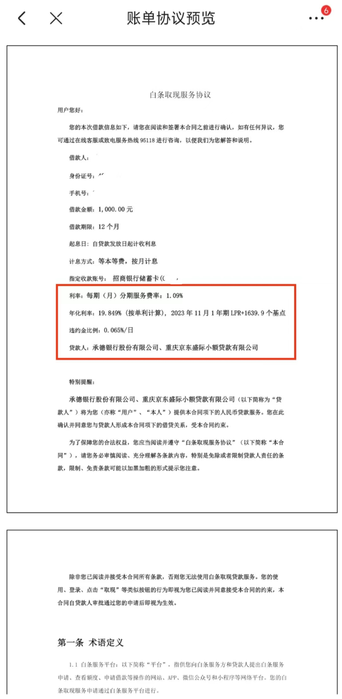而根据京东金融披露的《白条取现服务协议》显示,分期服务费率为1.09%/月,年化利率为19.85%(2023年11月1年期LPR+1639.9个基点),违约金比例0.065%/月,贷款人为承德银行、盛际小贷。