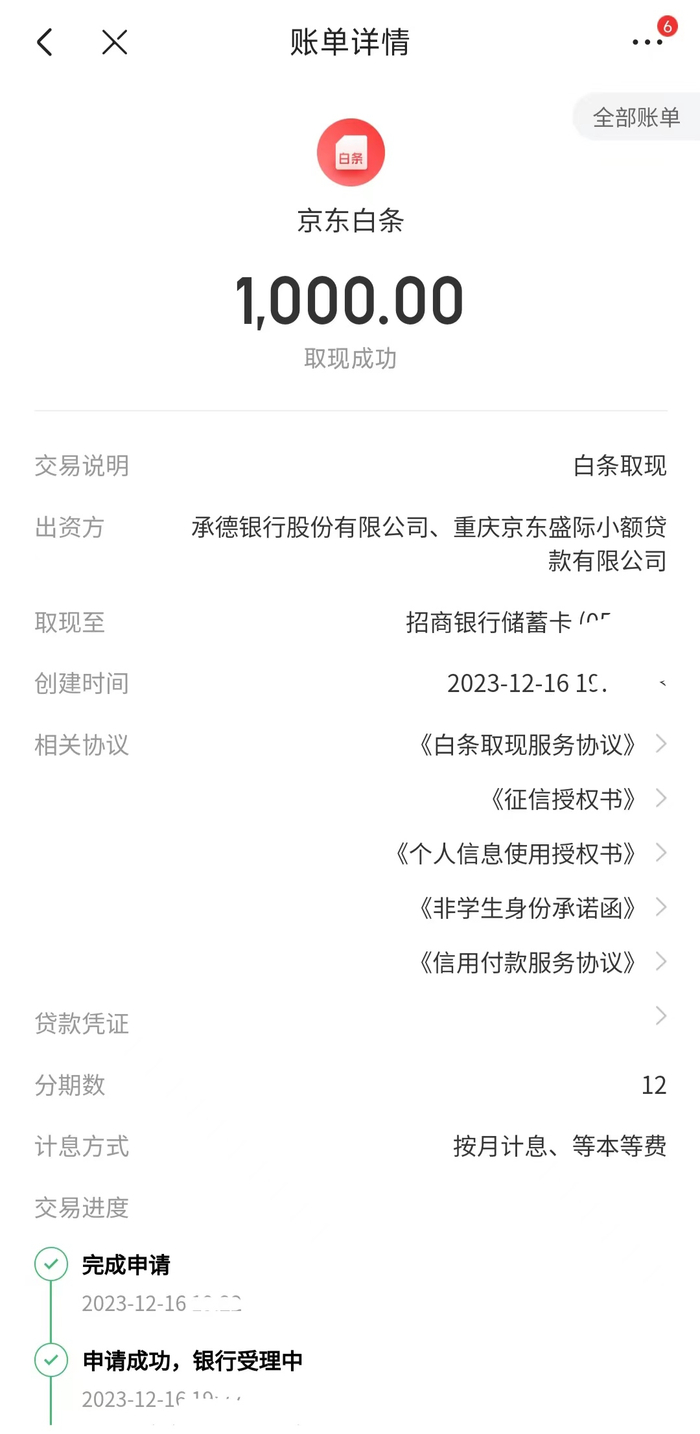 小编尝试白取现,页面默认提现3200元,默认分12期。小编修改了提现金额为1000元,但忘记了修改分期期数。白条取现全部账单显示,取现1000元,分12期,第1-10期每期偿还94.23元,第11-12期每期偿还83.33元。