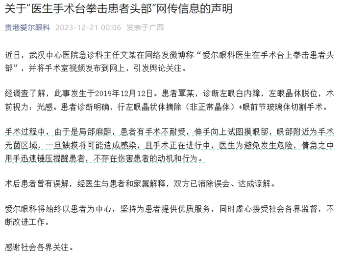 医生手术台拳击患者头部?贵港爱尔眼科深夜回应:已达成谅解