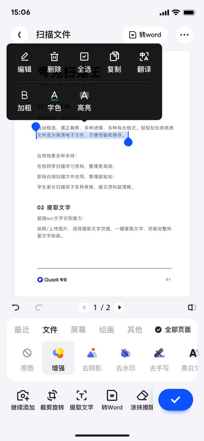 上文提到的两个场景是我们日常常见,却的确会存在困扰的地方。此外,夸克扫描王还具备以下功能:能够扫描已完成填写的纸质文档,并一键转化为Word格式,精准还原原始排版。它能自动识别手写笔迹,让用户选择删除或保留手写字体,并可将其智能转换为印刷体样式。用户还可以在线编辑Word文档中的文字内容。