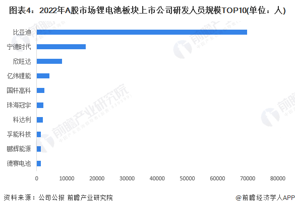 从2022年锂电池板块研发人员规模排名前十的公司来看,比亚迪以7.0万人的研发人员规模位列A股市场锂电池板块第一位。另外,宁德时代和欣旺达和分别以1.6万人和0.8万人的研发人员规模位列第二和第三。