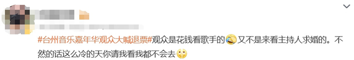 ​近日,有观众反映,浙江台州音乐嘉年华活动的歌手换场间隙,空场了半个小时,主持人上演现场求婚,导致大量观众不耐烦,全场高喊“退票”。
