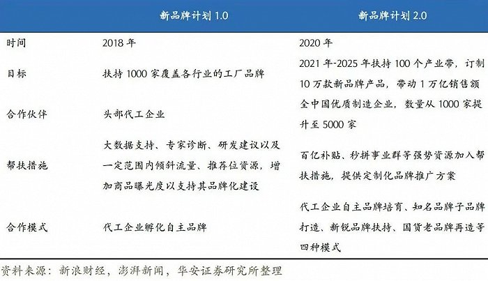 拼多多更早地捕捉到了这个趋势。早在2018年,拼多多就开启了新品牌计划,重点扶持代工厂,并逐渐扩大产业带,到2020年时,该计划进行升级,要在未来5年内,扶持100个产业带,带动1万亿销售额。此外,合作伙伴要从1000家扩展至5000家。除了以前的头部代工企业,更多优秀制造工厂会纳入其中。