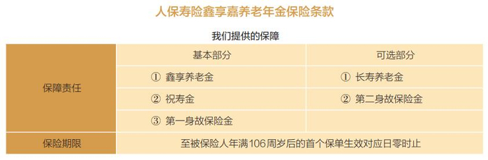 基本责任方面,值得一提的是,鑫享养老金提供保证领取至被保人年满80或85周岁的保证给付期;祝寿金是在鑫享养老金保证给付期满后,给予鑫享养老金领取金额的50%;若在鑫享养老金领取前身故,则可领取第一身故保险金。