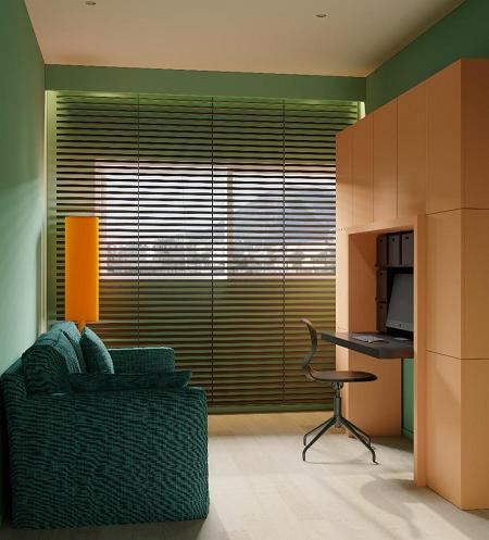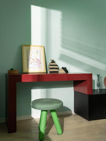 而在卧室、书房与浴室等私人空间的设计中,唯思则更注重以色彩提升居住体验。卧室采用同客厅一样的天湖蓝色,墙体与木作家具的自然纹理打造出令人舒适的松弛感。书房则运用了豆蔻绿、明橙色的碰撞,使空间温馨利落。浴室设计中,使用极具个性的红色壁柜实现收纳功能,带来静谧质感。