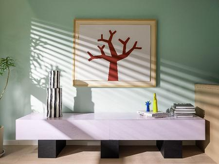 自然,唯思新品中最孟菲斯的部分,无疑是Aldo Cibic为唯思原创设计的定制家具。在玄关柜、餐边柜、衣柜等定制化家具中,简洁的线条和鲜艳的撞色风格随处可见。餐边柜开放区域中鲜艳的明黄色,与柜体的米白色撞色搭配,形成空间点缀。衣柜采用黄白横条纹与明黄色,以及红色渐变竖条纹与紫红色两款双饰面板,将条纹肌理与色块结合,呈现出迷人的混搭美感。
