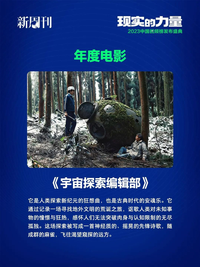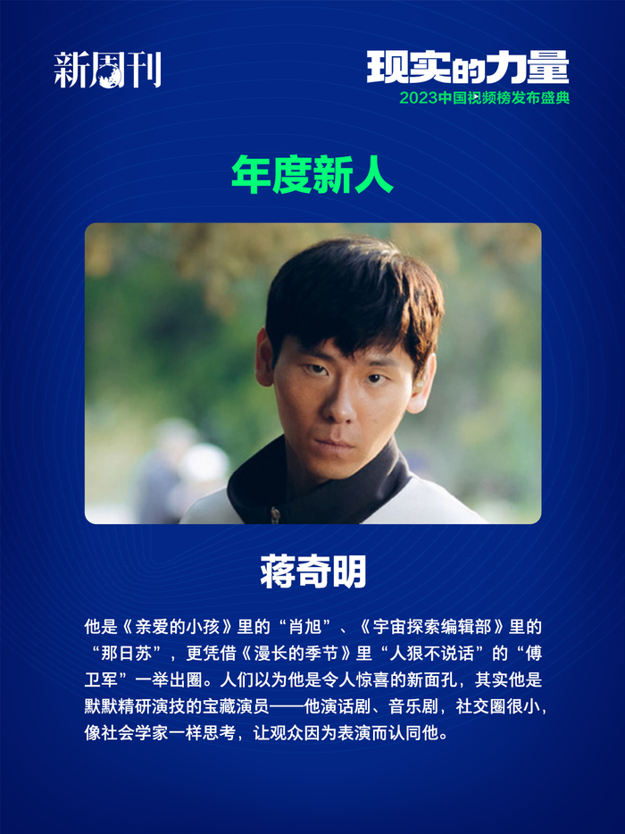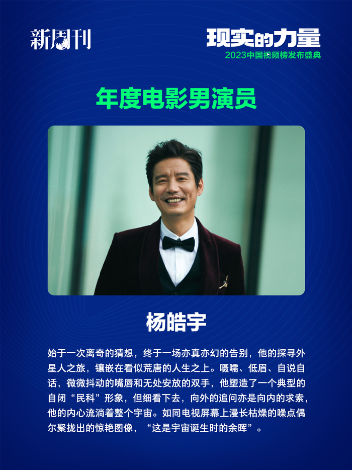 今年,新周刊将“年度电影男演员”“年度电影女演员”“年度新人”荣誉分别颁发给了杨皓宇、艾丽娅、蒋奇明。巧的是,他们都出演了本次获得“年度电影”荣誉的《宇宙探索编辑部》。