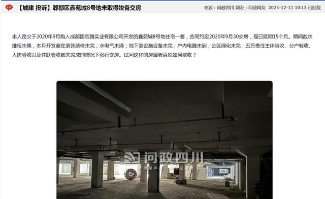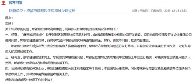 对此,12月18日,郫都区住房和城乡建设局作出回复,称该项目目前暂未完工,已明确告知开发企业,在项目未取得相关竣工验收备案等手续前,不能强制业主收房。同时要求开发商督促总包和精装单位加快剩余零星收尾工作,并尽快申请做备案验收,在完成验收后再启动正式交房。