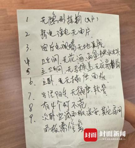 部分业主向记者表示,对房屋基装和精装的质量不满意,手写了部分房屋的修改意见,其中包括卫生间无花洒、面盆无水龙头等基础硬件缺失问题。年过六旬的老夫妇对记者说:“我们都是普通人,只能看到最基本的问题,连水龙头都没有,这房子到底怎么住?”