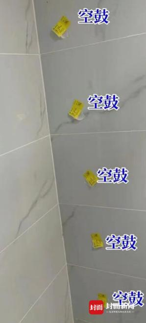 另一户业主家中,有抽油烟机,但开关机时异响严重。验房师说,该问题是油烟机管道逆阀处未打密封胶所致。这位业主家中也有部分零件“消失”,比如鞋柜把手,空调出风口百叶,而且家里瓷砖出现大面积空鼓,验房师表示,可能不到5年,瓷砖就会脱落。