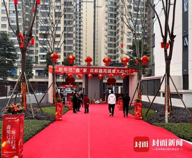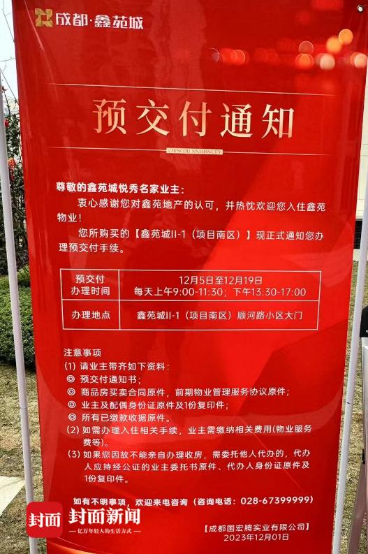 王女士称她在12月5日收到了“预交付通知书”,但记者看到小区大门上的横幅写着:新年住“鑫”家,成都鑫苑城盛大交付。现场与其他楼盘正式交付并无明显差异。