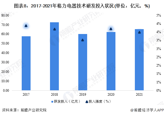 2017-2021年,格力电器研发投入金额波动变化。2021年格力电器研发投入金额为65.29亿元,相比2020年上升了5.07%;研发投入占比为3.48%,相比2020年小幅下降。
