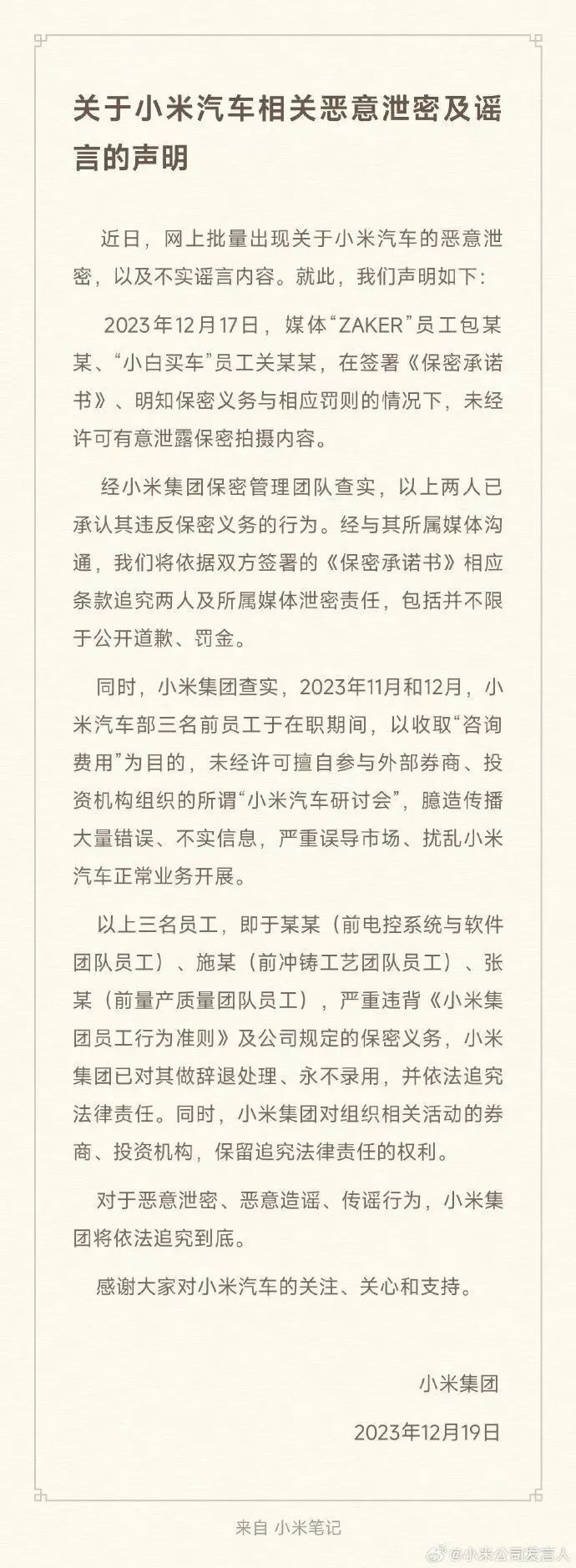 2023年11月和12月,小米汽车部三名前员工于在职期间,以收取“咨询费用”为目的,未经许可擅自参与外部券商、投资机构组织的所谓“小米汽车研讨会”,臆造传播大量错误、不实信息,严重误导市场、扰乱小米汽车正常业务开展。