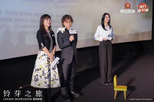 对于《铃芽之旅》通过中影“预约放映”与中国观众再次见面的形式,现场观众也热情向新海诚导演“表白”,“我是转成从日本飞回上海的,能再次看《铃芽之旅》是这个冬天我遇见的最温暖的事”,“我因病在家休息了半年左右,当时在影院看到您的作品,从此获得了许多动力,也找到了很多的朋友,还找到了我的女朋友。”。有观众开心表示:“预约放映的模式蛮有趣的,同好们可以坐在一个密闭的空间里面,聊自己喜欢的作品,还可以和导演交流感觉非常好。”