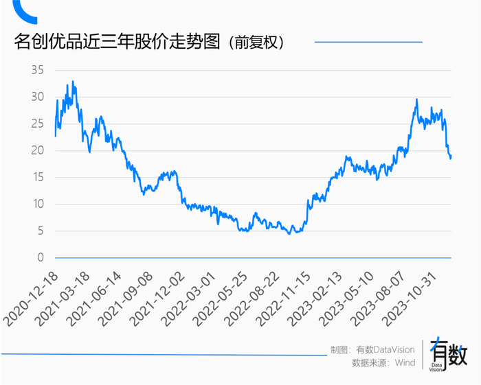 过去三年里,做线下生意的名创优品在水深火热里挣扎:多开了近一千家店,但是营收却几乎没有变化;股价一路向下,由最高点的33.4美元一路跌至4.38美元。