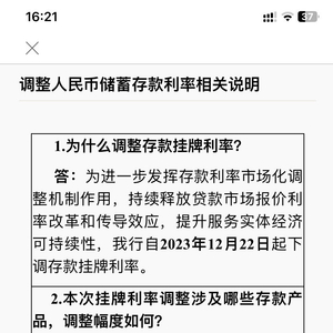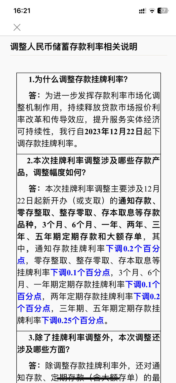 12月21日下午,工商银行app挂出《调整人民币储蓄存款利率相关说明》,称“为进一步发挥存款利率市场化调整机制作用,持续释放贷款市场报价利率改革和传导效应,提升服务实体经济可持续性,我行自2023年12月22日起下调存款挂牌利率”。