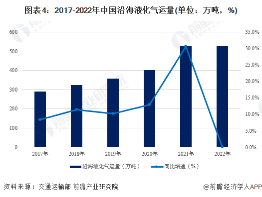 液化天然气运输量方面,2017-2022年,中国沿海液化气运量不断上升。2022年,中国沿海液化气运量为528万吨,同比增长0.06%。