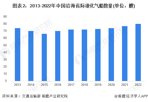 2013-2022年,中国沿海省际液化气船先减后增。2022年,中国沿海省际液化气船共计80艘(共计28.8万载重吨),同比增长3.9%。