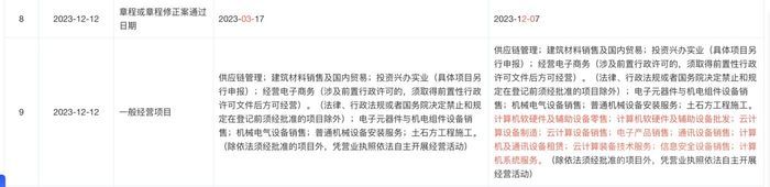 变更前,深圳润信一般经营项目为“供应链管理、建筑材料销售及国内贸易、投资兴办实业等”。变更后,深圳润信的一般经营项目新增了“计算机软硬件及辅助设备零售、计算机软硬件及辅助设备批发、云计算设备制造、云计算设备销售等”。
