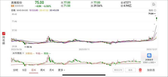 二级市场方面,奥雅股份在发布采购含英伟达芯片算力设备的公告后,公司股价迎来暴涨,在12月18日至12月20日三个交易日涨停。不过,或受收函影响,今日开盘后,公司股价一度跌超7%,随后跌幅有所收窄,最终报收75元,跌幅6.06%,换手率为39.56%。