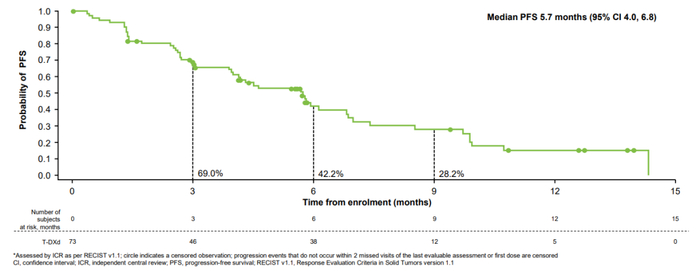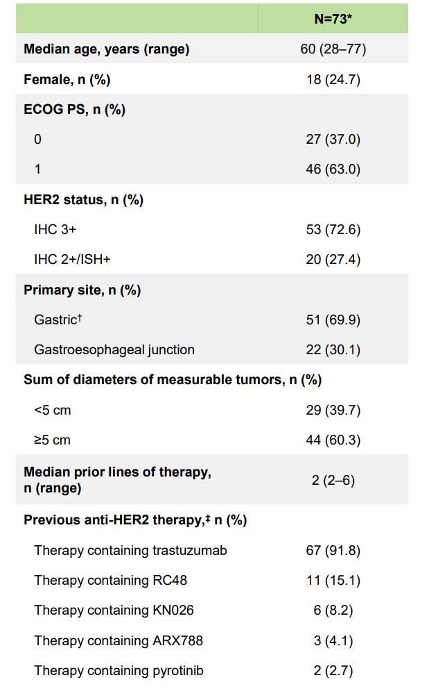 研究结果表明,在73例FAS人群中,中位随访时间为8.0个月,ICR评估的cORR为28.8%,其中IHC 3+和IHC 2+/ISH+组的ORR分别为32.1%和20.0%;INV评估的cORR为35.6%。中位PFS和中位OS分别为5.7个月和10.2个月,中位DOR为7.9个月。