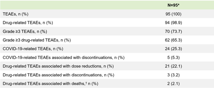 在95例安全性分析集人群中,总体安全性特征可管理。在安全性随访期内,25.3%的患者观察到COVID-19相关TEAEs,COVID-19相关TEAEs导致的停药为5.3%。根据独立委员会的判定,3.2%的患者发生ILD/非感染性间质性肺炎,且均为1、2级;无3级以上ILD/非感染性间质性肺炎发生。