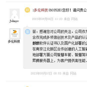 在11月15日晚多伦科技发布的《股票交易风险提示公告》中,公司表示,前述“公司作为华为昇腾AI产业链的重要合作伙伴之一”的合作内容,主要是指取得华为公司相应的技术认证书即兼容性测试,并根据产品实施需求向第三方采购华为的产品并使用。