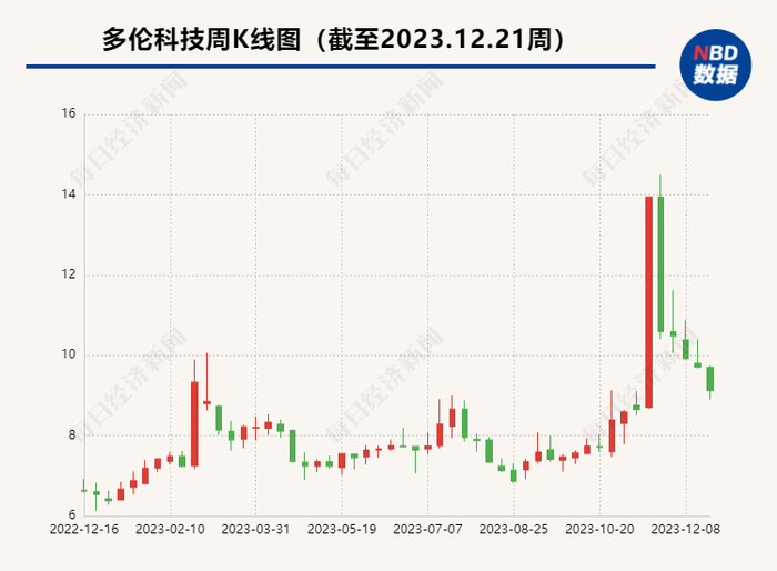 另外,10月23日~11月20日,多伦科技股价大幅上涨,一度涨至14.50元/股,累计涨幅高达88.07%。冲高之后,公司股价持续下滑,截至12月21日,报收9.12元/股,相比高位累计下滑37.10%。