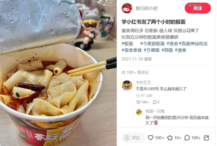 但毕竟是经历过新消费浪潮洗礼的年轻消费者,惊讶的时间,往往和对品牌的忠诚度成正比,短暂惊讶后,讨论的焦点,逐渐从“为什么这么久”,走向了“这款板面,到底是泡20分钟好吃,还是泡30分钟好吃”,网友们还分享起了各自的心得。