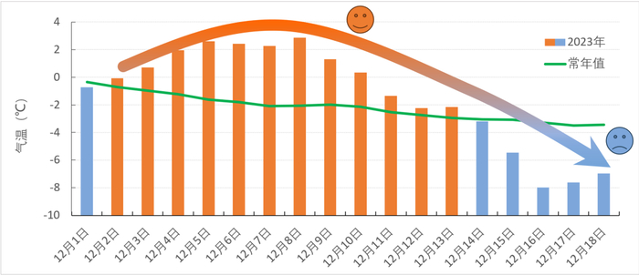今年12月上旬偏暖显著,月中降温幅度大。12月以来(截至18日)北方大部地区降水显著偏多。这期间,全国平均气温-1.3℃,较常年同期偏高0.9℃,全国大部地区气温以偏高为主。