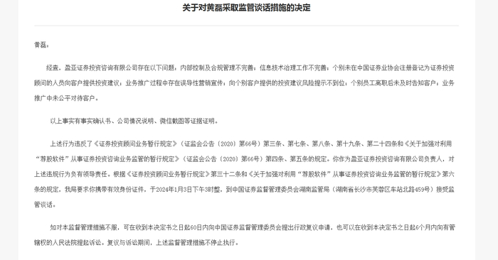 同日,湖南证监局还披露了关于对黄磊采取监管谈话措施的决定,湖南证监局表示,上述行为违反了规定,黄磊作为盈亚证券投资咨询有限公司负责人,对上述违规行为负有领导责任。根据《证券投资顾问业务暂行规定》第三十二条和《关于加强对利用“荐股软件”从事证券投资咨询业务监管的暂行规定》第六条的规定,湖南证监局要求黄磊到中国证券监督管理委员会湖南监管局(湖南省长沙市芙蓉区车站北路459号)接受监管谈话。